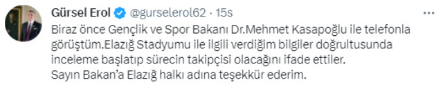 Daha sonra bir paylaşım daha yapan Erol, Gençlik ve Spor Bakanı Mehmet Kasapoğlu ile bir görüşme yaptığını belirtti. Gürsel Erol paylaşımında, "Biraz önce Gençlik ve Spor Bakanı Dr. Mehmet Kasapoğlu ile telefonla görüştüm. Elazığ Stadyumu ile ilgili verdiğim bilgiler doğrultusunda inceleme başlatıp sürecin takipçisi olacağını ifade ettiler. Sayın Bakan'a Elazığ halkı adına teşekkür ederim." dedi.