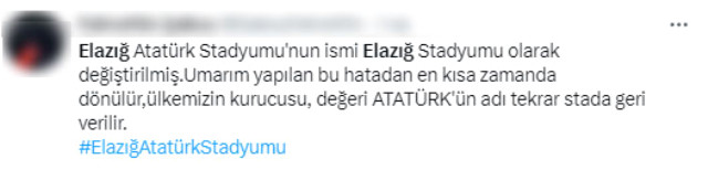 Elazığ'ın 1974'ten bu yana maçlarını oynadığı Atatürk Stadyumu, yeniden inşa edildi ve stada asılan yeni tabelada "Elazığ Stadyumu" yazdığı görüldü. Atatürk adının tabelada yer almaması ise sosyal medyada büyük eleştiri aldı.