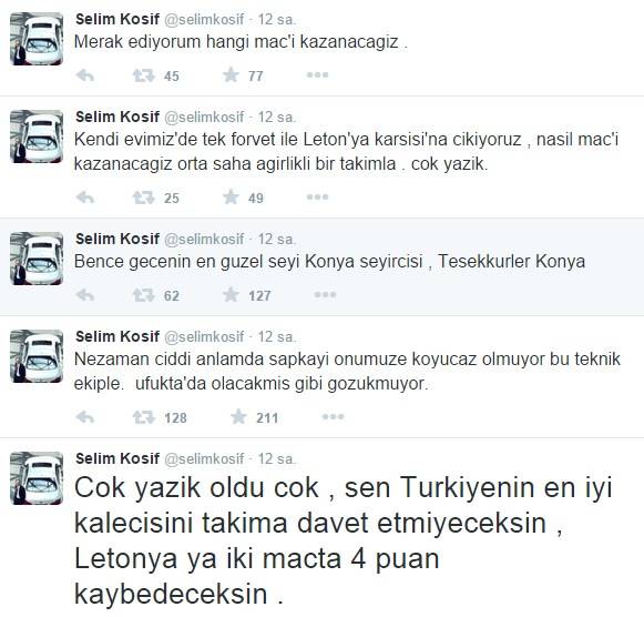 Konya'daki taraftarlara teşekkür eden Kosif, "Ne zaman ciddi anlamda şapkayı önümüze koyacağız. Bu teknik ekiple olmuyor. Ufukta da olacakmış gibi gözükmüyor. Çok yazık oldu çok. Sen Türkiye'nin en iyi kalecisini takıma davet etmeyeceksin. Letonya'ya iki maçta 4 puan kaybedeceksin." ifadelerini kullandı.
