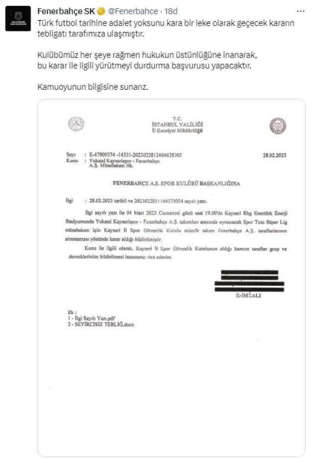 Kayseri İl Güvenlik Kurulu tarafından alınan karar gereğince Kayseri spor ile Fenerbahçe arasında oynanacak maça sarı-lacivertli taraftarların alınmayacağı açıklanmıştı. Büyük tepki çeken karar sonrası Fenerbahçe, "Takımımızın, 4 Mart 2023 Cumartesi günü deplasmanda Yukatel Kayseri spor ile oynayacağı maça, Kayseri İl Güvenlik Kurulu gereğince taraftarımızın alınmayacağını şaşkınlık içinde öğrenmiş bulunuyoruz. Fenerbahçe Spor Kulübü olarak bu kararı kabul etmemiz hiçbir şekilde mümkün değildir." ifadeleri kullanılarak, mahkemeye yürütmenin durdurulması için başvuruda bulunmuştu.