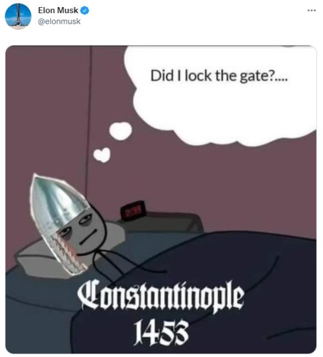 Musk'ın Bizans askerinin yatakta yattığına ilişkin paylaştığı karikatürde, "Did I lock the gate? (Kapıyı kilitlemiş miydim?)" ifadesi bulunurken, görselin altında ise "Constantinople 1453" yazısı yer aldı.