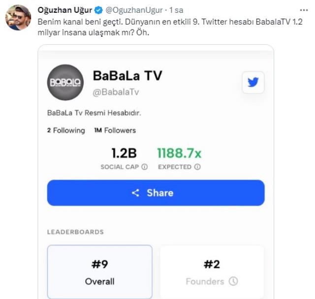 Oğuzhan Uğur'un depremlerin ardından yaptığı yardım çağrılarıyla günlerce konuşulan Babala TV hesabının Twitter adresi ise listenin 9. sırasında yer aldı. Kendi hesabı listenin 57'inci sırasında yer alan Uğur, Twitter hesabından yaptığı paylaşımda "Benim kanal beni geçti. Dünyanın en etkili 9. Twitter hesabı BabalaTV 1.2 milyar insana ulaşmak mı? Öh" dedi.