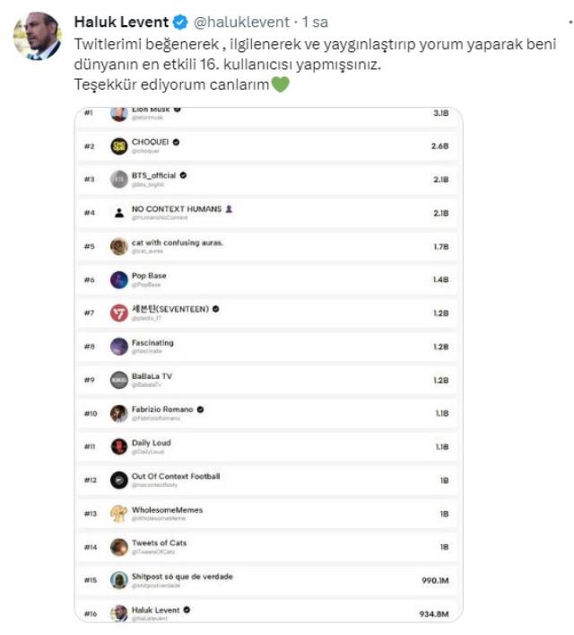 Kahramanmaraş merkezli meydana gelen depremlerde kurucusu olduğu Ahbap Derneği ile yaptığı yardımlarla adından söz ettiren Haluk Levent'in Twitter hesabı listenin 16. sırasında yer aldı. Twitter hesabından paylaşım yaparak takipçilerine teşekkür eden Levent, "Tweetlerimi beğenerek , ilgilenerek ve yaygınlaştırıp yorum yaparak beni dünyanın en etkili 16. kullanıcısı yapmışsınız. Teşekkür ediyorum canlarım" ifadelerini kullandı.